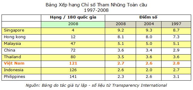 Quá trình và hiện trạng của tham nhũng Việt Nam trong mối tương quan cạnh tranh với các nước trong khu vực biểu hiện rõ nét hơn qua điểm số tổng hợp đo lường mức độ tham nhũng trải dài hơn thập niên qua. Kết quả dưới đây cho thấy điểm số tham nhũng của Việt Nam vẫn ở tình trạng dậm chân tại chỗ, hầu như không thay đổi trong suốt giai đoạn 1997-2008 với các điểm số 2.8, 2.6, 2.7. So sánh với các nước trong khu vực, vị thứ tham nhũng hiện nay của Việt Nam khá hơn Indonesia 5 bậc, Philippines 20, và xấu hơn Thái Lan 41 bậc, China 49, Malaysia 74, Hong Kong 109, và Singapore 117 bậc (10).