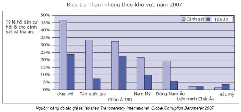 Nạn tham nhũng tại khu vực Châu Á Thái Bình Dương khá cao, chỉ đứng sau Châu Phi và khu vực Tân Quốc gia (Russia, Ukraine, Moldova) trong số 8 khu vực, theo Báo cáo Tham Nhũng Toàn cầu năm ngoái (GCR-2008). Cuộc điều tra tìm hiểu tỷ lệ hộ dân cư hối lộ cho cảnh sát và tòa án, là hai lĩnh vực tham nhũng cao nhất trong tổng số 11 địa hạt được điều tra. Kết quả cuộc điều tra cho thấy một phần ba hộ dân cư khu vực Châu Á TBD đã hối lộ cho cảnh sát và hơn 20% hộ đút lót cho tòa án (7).