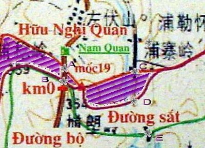 Để có thể nhìn rõ hơn khu vực trước Hữu Nghị Quan, tôi đã trích một phần của tấm bản đồ nói trên và phóng lớn hơn (ảnh 12). Để giúp độc giả dễ theo dõi, các vùng mà phía Trung Quốc vẫn còn lấn chiếm được đánh dấu bằng sọc màu tím trên bản đồ.