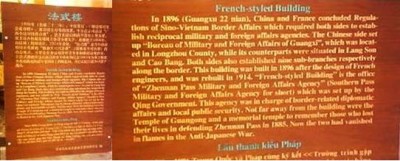 Căn cứ vào nội dung của một tấm bảng quảng cáo được dựng tại khu vực Hữu Nghị Quan (ảnh 27), người ta được biết: Tòa nhà kiểu Pháp (hoặc Lâu đài Pháp Quốc) được xây dựng vào năm Quang Tự thứ 22 (1896), dựa theo thiết kế của các kỹ sư người Pháp. Tòa nhà này là trụ sở của “Sở quân sự và ngoại giao tại Trấn Nam Quan” (Zhennan Pass Military anh Foreign Affairs Agency) do chính phủ nhà Thanh thành lập; cơ quan này chịu trách nhiệm về các vấn đề ngoại giao và an ninh công cộng tại địa phương[2]. Không xa tòa nhà là Đền Quan Công và một ngôi miếu để tưởng nhớ những người đã ngã xuống trong việc bảo vệ Trấn Nam Quan vào năm 1885. Cũng dựa theo tấm bảng quảng cáo, cả hai công trình (tức ngôi đền và ngôi miếu) đều “đã bị cháy trong cuộc chiến tranh kháng-Nhật”.