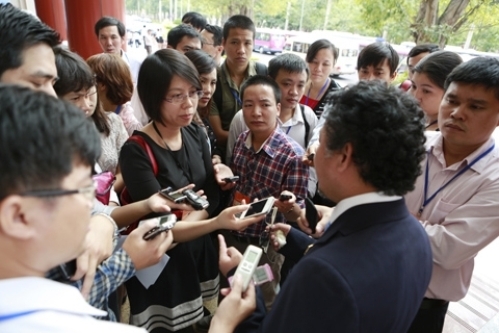 Ông Đặng Thành Tâm trong vòng vây của báo chí trong lần trở lại nghị trường đầy bất ngờ sáng 30/10/2012.
