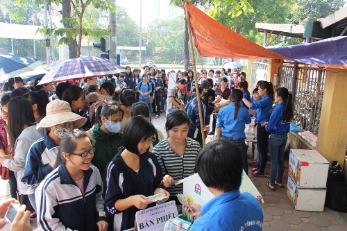 Mọi người bắt đầu xếp hàng từ 10h đến 10h30 thì bắt đầu các bạn tình nguyện viên câu lạc bộ Hope bán phiếu mua cơm với giá 5.000 đồng, ai cũng đều hồ hởi chờ đợi.