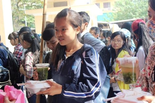 Cầm suất cơm trên tay, bạn Lương Thị Tú (sinh viên năm 3 trường Đại học Khoa học Xã hôi & Nhân văn) cho biết : “Ở đây em thấy các bạn tình nguyện viên thật sự chu đáo, những suất cơm được đóng hộp cẩn thận, bên trong cơm rất dẻo và thơm, các món ăn có vị lạ miệng rất dễ ăn. Ngoài ra mọi người còn được phát cả quạt giấy để xua tan cái nóng bên ngoài nữa.”
